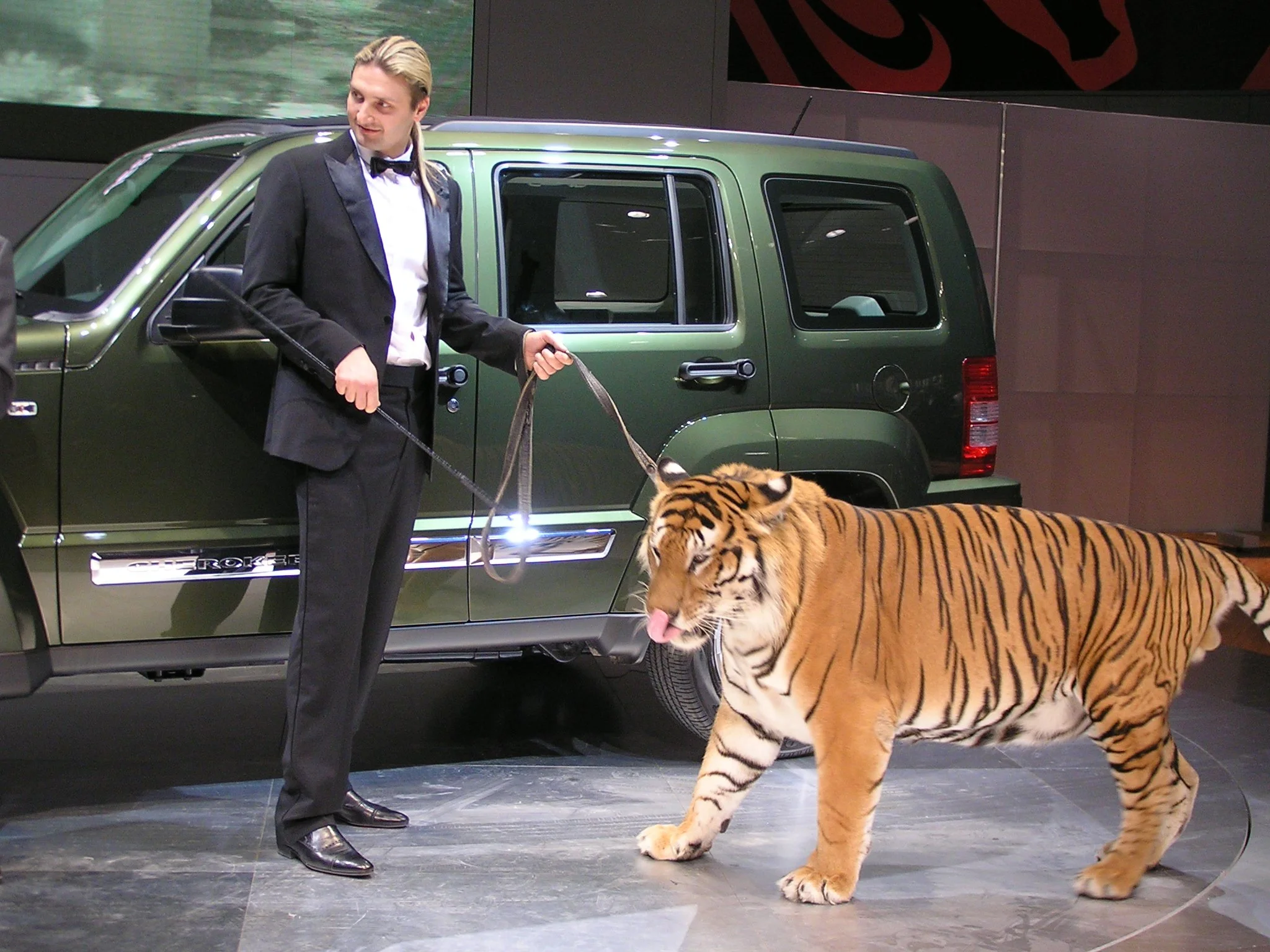 Russian introduction of the Jeep Cherokee with aid of a tiger! Moscow International Auto Show 2008. (Photo: John Stech, Managing Director, Chrysler Russia at this time.)